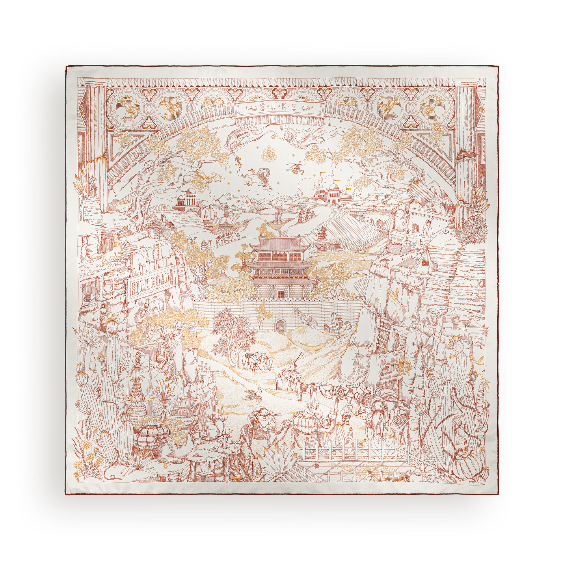 The design was created by Chinese artist Qín Yuèbīn (秦月宾) , known for his dreamlike compositions inspired by nature and classical Chinese culture. His exclusive designs, created especially for this collection, evoke the landscapes crossed by the Silk Road, between misty mountains, lush vegetation and ancient architecture.