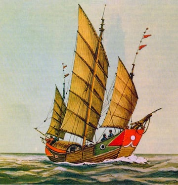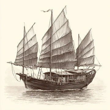 Navires à voiles lattées et gouvernail de poupe, compartimentés par cloisons étanches. Taillées pour les moussons et le long cours, elles alliaient robustesse et souplesse, portant soieries et idées d’un rivage à l’autre.